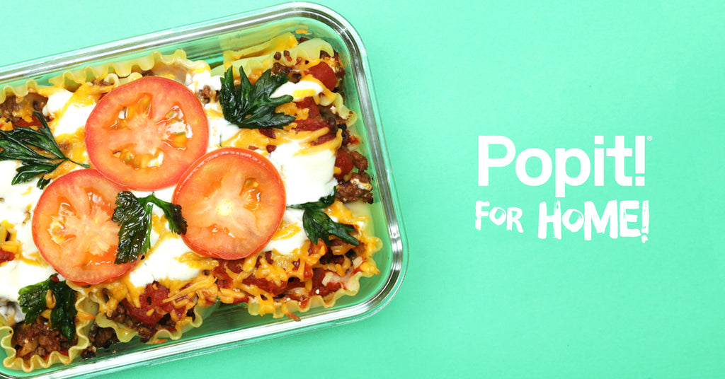 Lay out the pasta stripes and spread cream cheese on them. Add some shredded gouda and cheddar cheese. Pour some tomato sauce with a spoon and then add the thick sauce ground beef sauce too. Wrap it up and place it on your glass Popit! container. Do this until your Popit! container is full. Add more of everything! (sauce and cheese). Bake at 420°F for 25 minutes, let it cool for a little bit and serve.